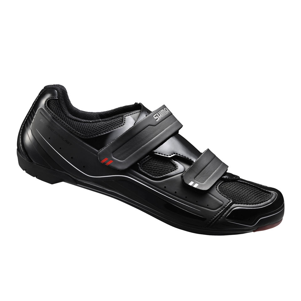| The Shimano R065 Road Cycling Shoes have a high-density synthetic leather and mesh upper with dual hook-and-loop straps for comfort and support. Boasting a flat insole and uniform under-foot cushioning, the bike shoes have a Shimano Dynalast which provides a precise fit and pedalling efficiency. They're set upon a lightweight glass fiber reinforced-polyamide sole. - L.M. Features: High Density synthetic leather and mesh Air Intake: Integrated air intake and exhaust system Wider Cleat: Expands range for mounting cleats Shimano Dynalast: Provides a precise fit and improves peddling efficiency Flat insole Uniform under-foot cushioning Lightweight glass fiber reinforced-polyamide sole Designed for road use Compatible with SPD and SPD-SL cleats Weight: 480g